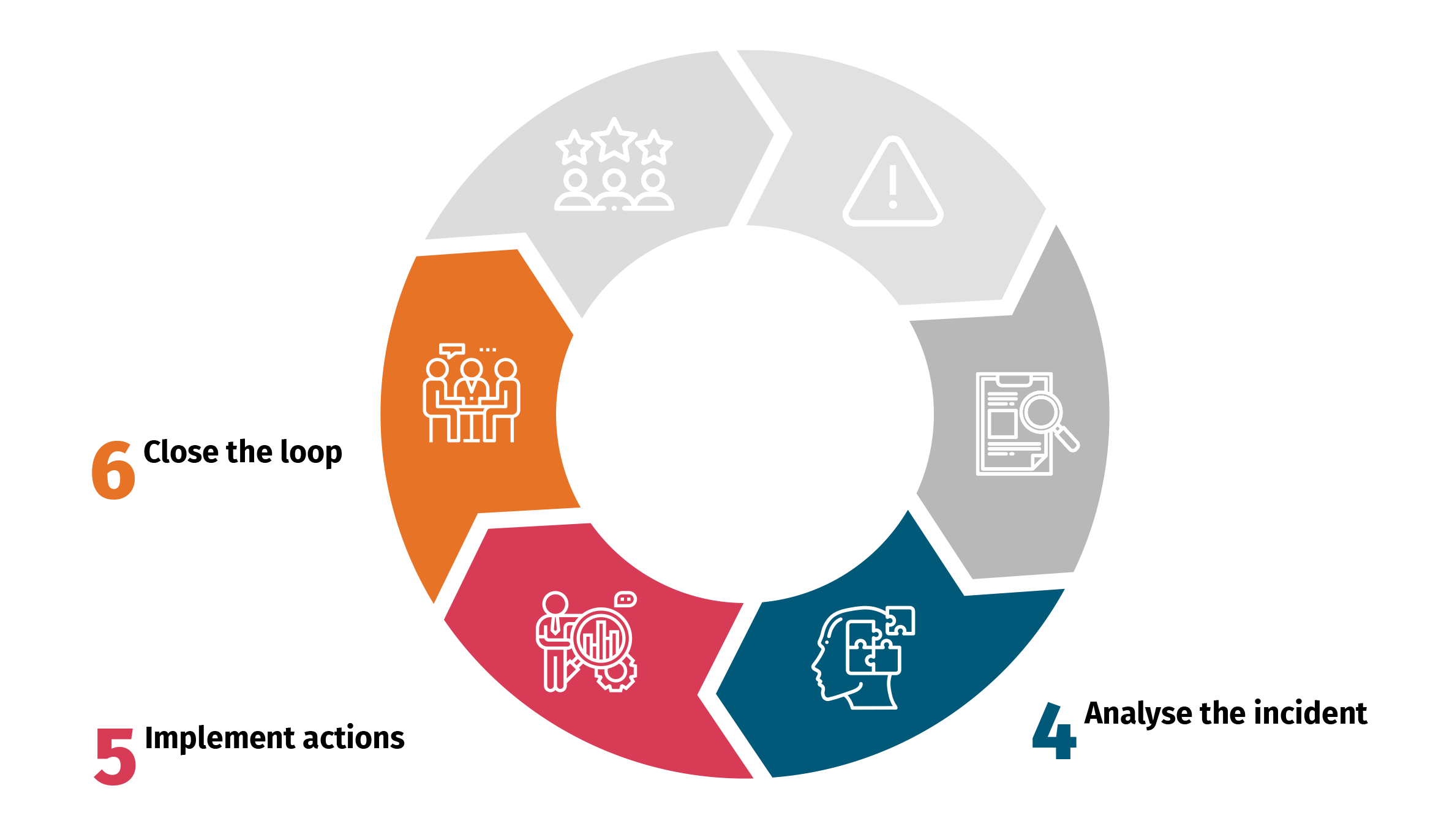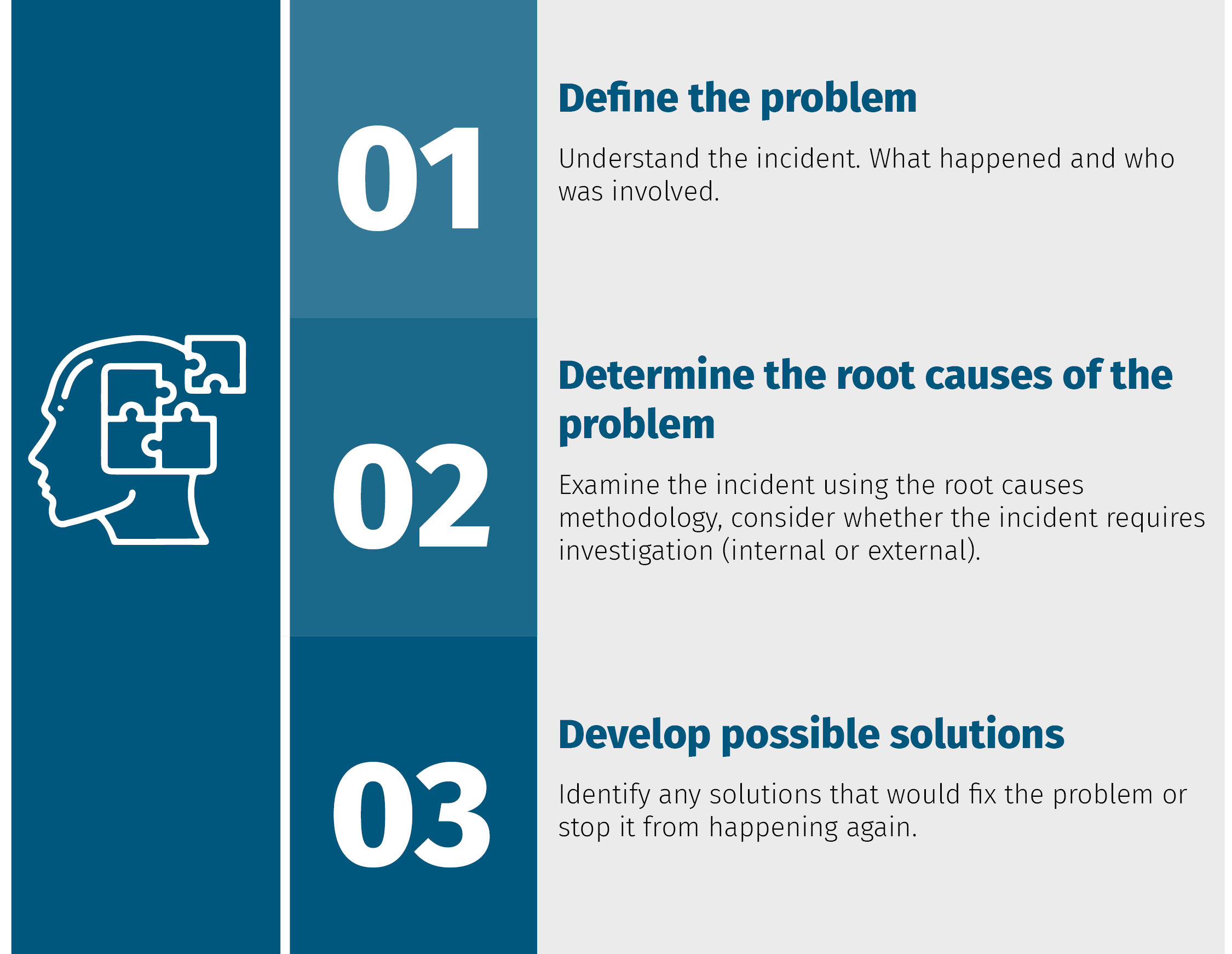 An analysis should follow each incident, although the level and extent of the analysis may vary. You should follow these 3 steps of the problem-solving process: