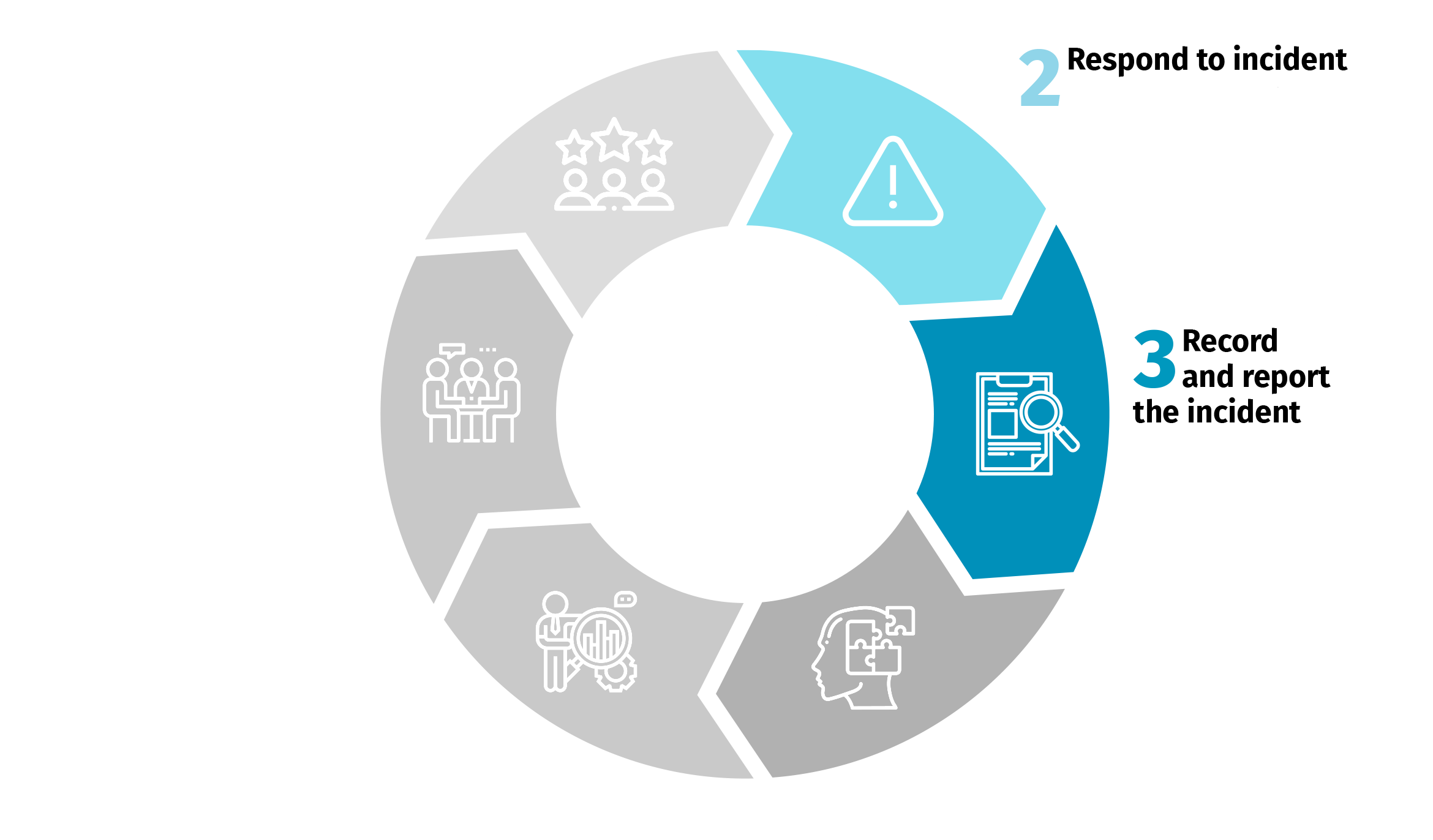 When an incident occurs, you must take immediate action to support and assist those involved. During your response, you must examine the level of harm or impact to those involved in the incident and ensure there are no further threats or safety issues that need immediate attention.