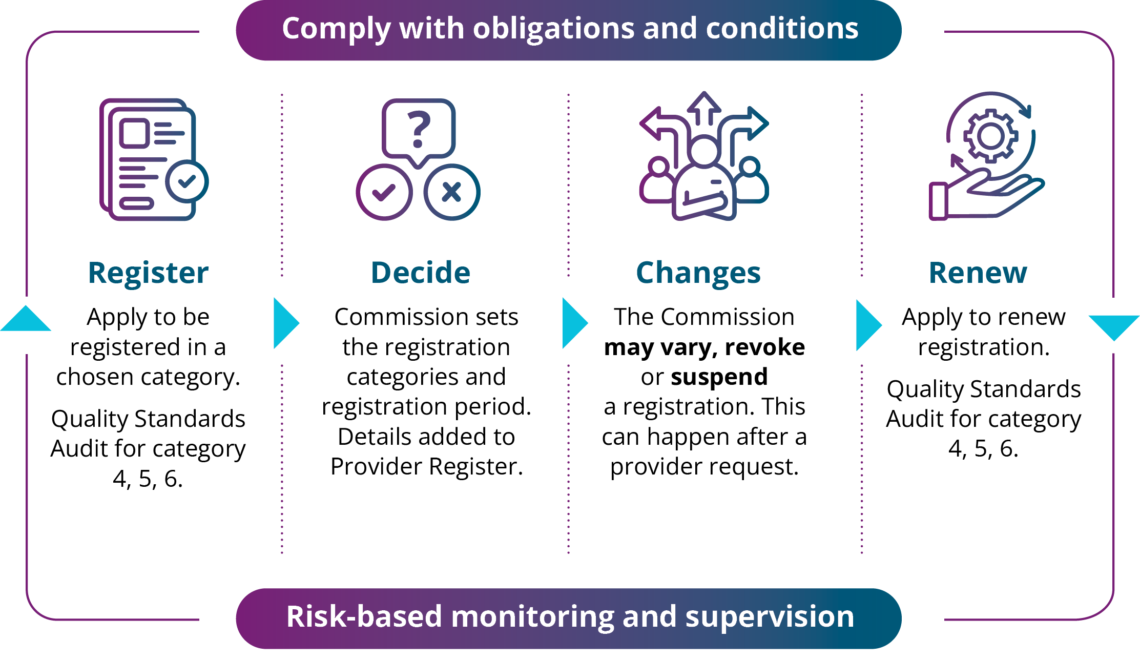 - Registration and renewal – overview of the process of becoming a registered provider, and registration categories