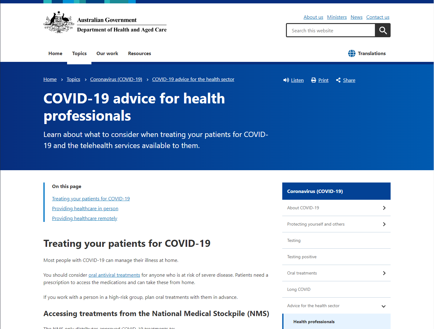 This resource offers COVID-19 guidance for health professionals, including infection prevention, antiviral treatments, and telehealth services. It advises on managing high-risk patients, accessing personal protective equipment (PPE), and maintaining hygiene standards. It is essential for ensuring safe healthcare delivery, particularly in aged care settings during the pandemic.