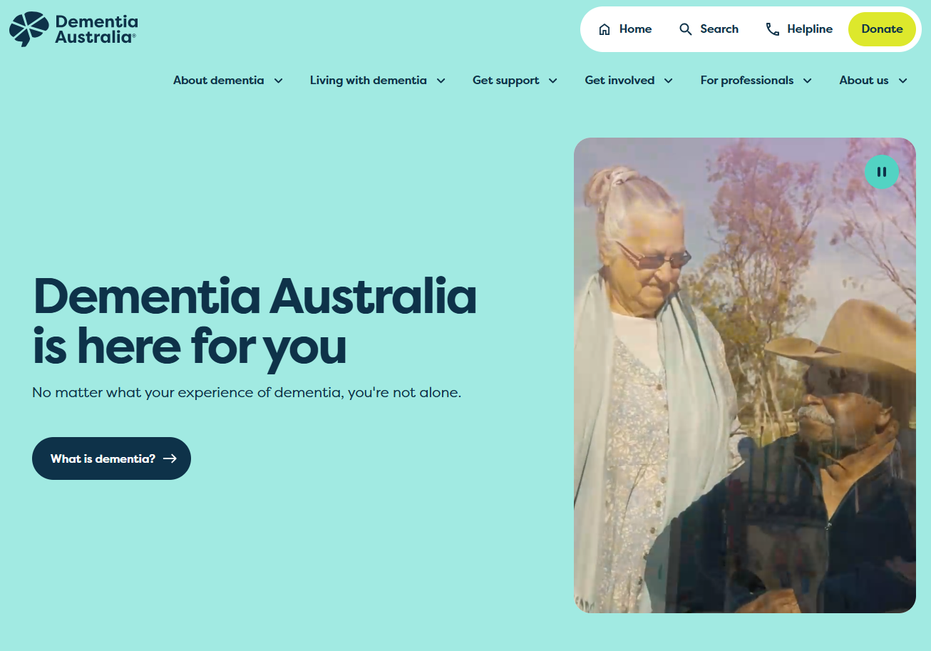 This resource is the Dementia Australia website. The website contains information about the types of dementia, testing, diagnosis, treatment and management of dementia. It includes information about living with dementia, such as behaviour changes, nutrition, staying connected and care options. It also contains information for professionals supporting people living with dementia, including research, tools and other resources.