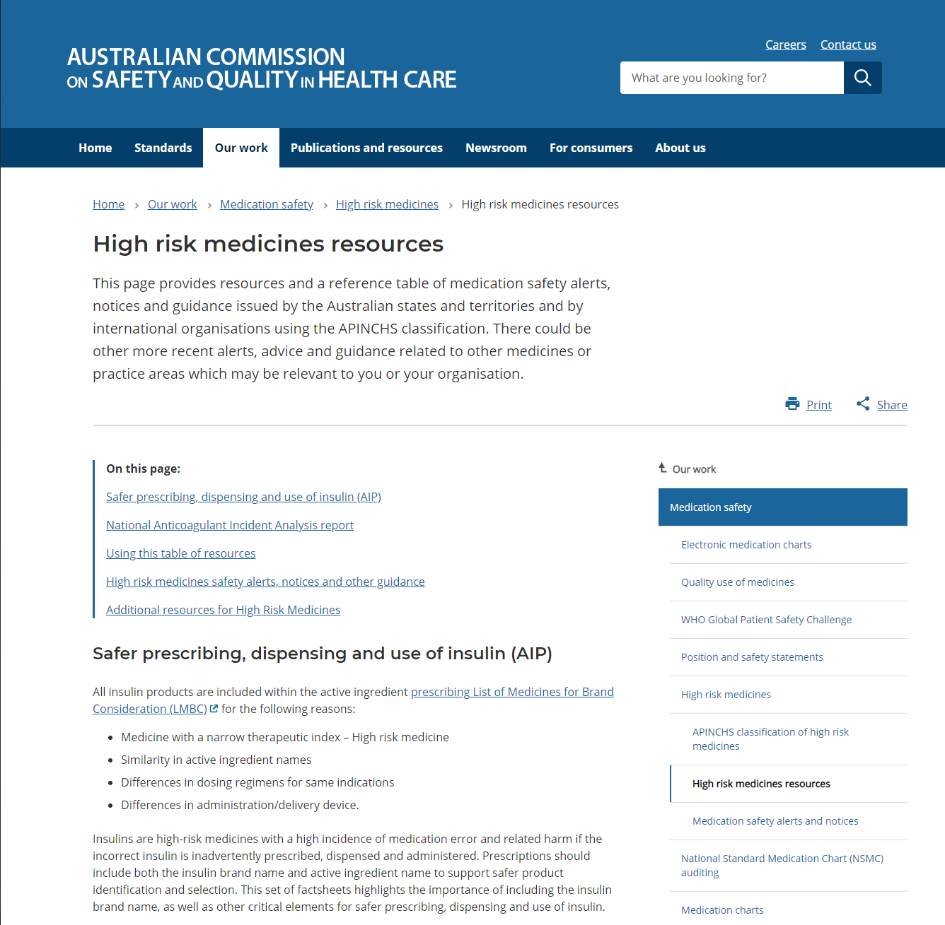 This resource provides guidance on high-risk medicines, including safety alerts, notices, and best practices for safe prescribing, dispensing, and administration. It includes information on insulin and anticoagulant safety, monitoring tools, and best practice recommendations to improve medication safety and reduce harm from high-risk medications across healthcare settings.