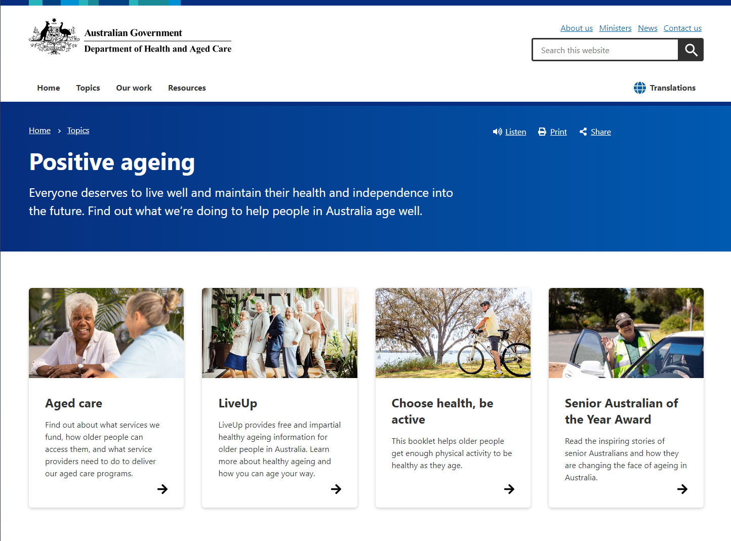 This resource focuses on positive ageing, encouraging older people to maintain their health, independence, and connection to community. It covers planning for healthy ageing, staying physically active, and accessing aged care services when needed. The resource promotes ageing as a positive experience, offering practical guidance to support older people in living well. This resource may refer to information that will be updated from 1 November 2025 to align with the new Aged Care Act and Quality Standards.