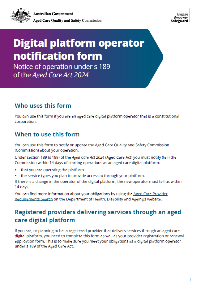 The information in this fact sheet provides general guidance only. It’s your responsibility to know your obligations and legal responsibilities under the Act and the Aged Care Rules.