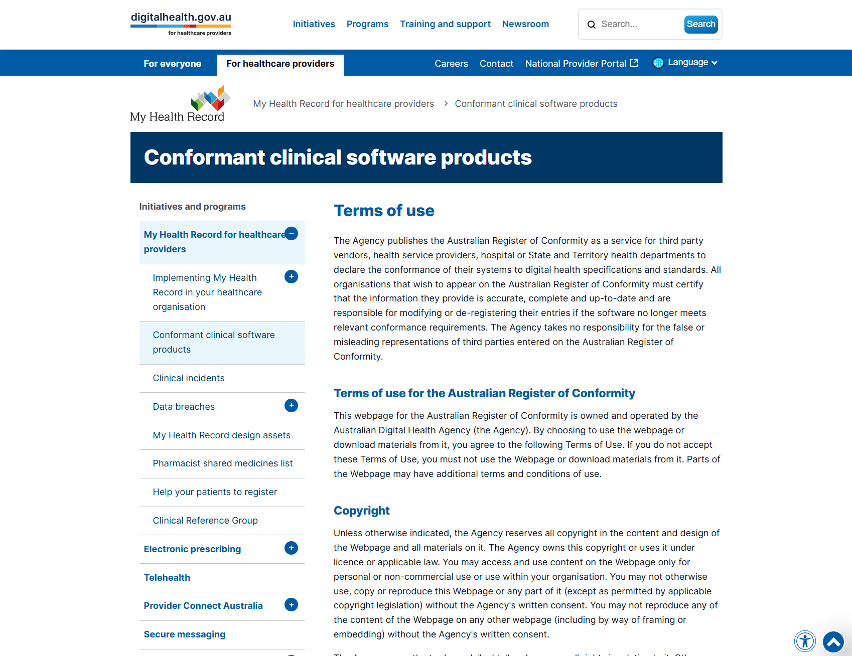 This resource provides a register of conformant clinical software products that meet national digital health requirements, enabling functions like My Health Record access, health summary uploads, and prescription management. Organisations using the register should verify entries’ currency and accuracy as updates depend on software developers.