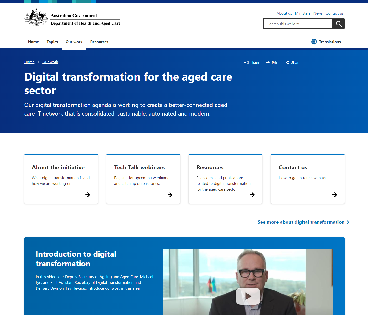 This resource outlines the digital transformation agenda for the aged care sector in Australia, focusing on creating a consolidated, sustainable, and modern IT network. It includes strategies for improving connections between clients, providers, and the government, offering webinars and resources to support this transition.