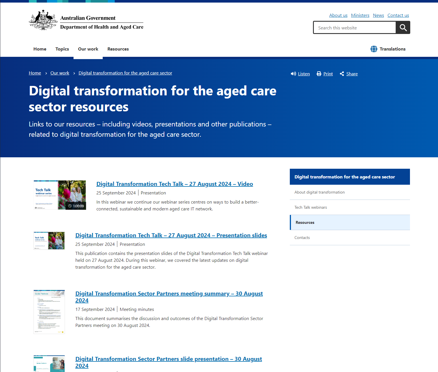 This resource provides access to various materials related to digital transformation in the aged care sector, including videos, presentations, and meeting summaries. It offers insights into building a modern, connected aged care IT network and shares updates from sector partner meetings on digital transformation initiatives.
