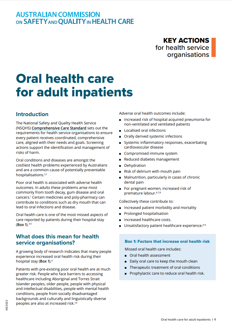 This resource provides guidance on oral health care for adult inpatients, aligning with the Comprehensive Care Standard. It outlines the importance of oral health assessment, daily care, infection control, and discharge planning to prevent adverse outcomes such as infections, dehydration, and malnutrition, enhancing patient experience and care quality.