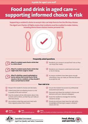 This resource provides guidance for aged care staff on supporting older people's informed choices regarding food and drink, even when those choices involve personal risks. It encourages staff to respect resident autonomy, provide information on risks, document decisions, and ensure access to professional advice, promoting dignity and quality of life in care settings. This resource may refer to information that will be updated from 1 November 2025 to align with the new Aged Care Act and Quality Standards.