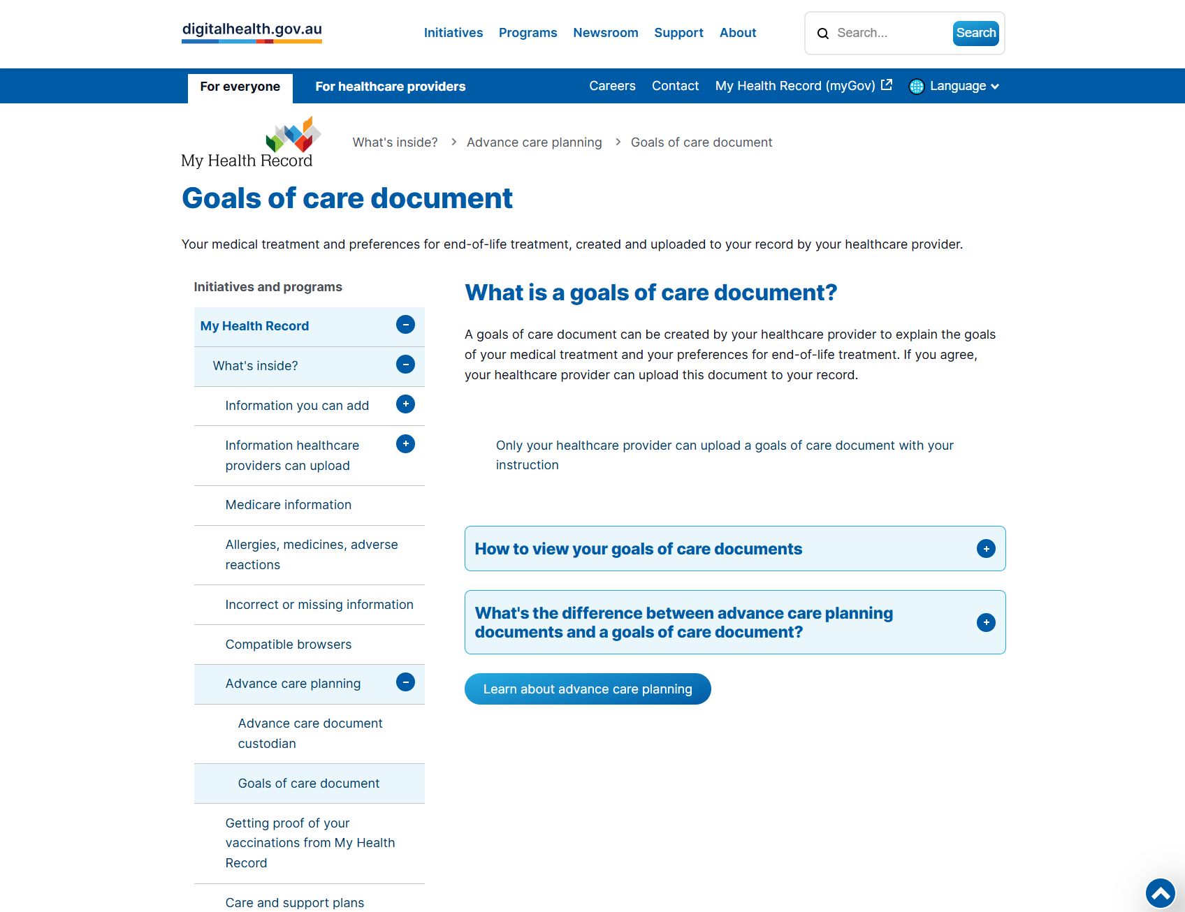 This resource explains the purpose of a goals of care document, which outlines a person’s medical treatment goals and end of life care preferences. It describes how healthcare providers create and upload these documents to health records, supporting informed decision-making and access to care preferences.