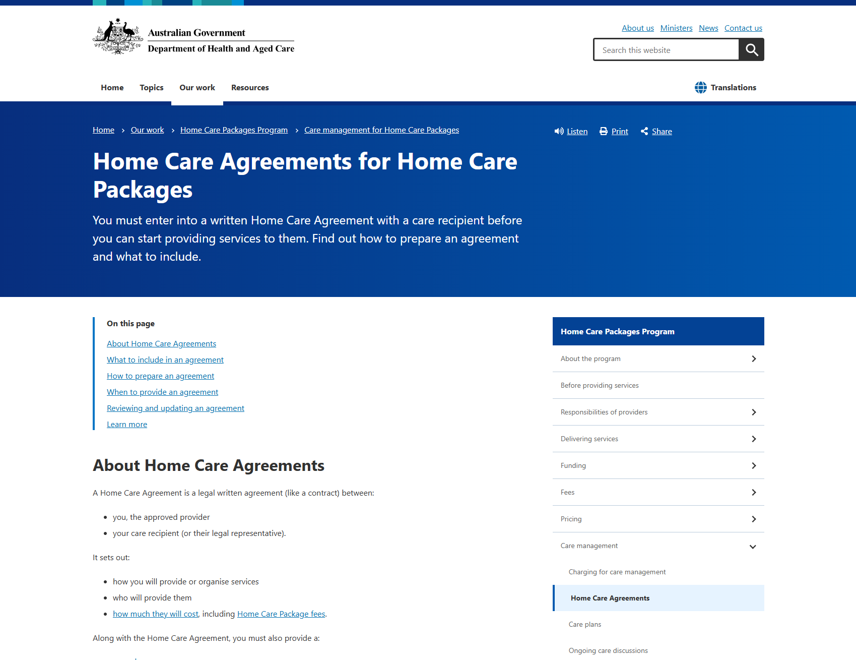 This resource explains requirements for Home Care Agreements in the Home Care Packages Program, detailing the roles of providers and care recipients, fees, and service terms. It emphasises collaboration to make sure agreements are clear, fair, and reviewed regularly, supporting person-centred care in home settings.