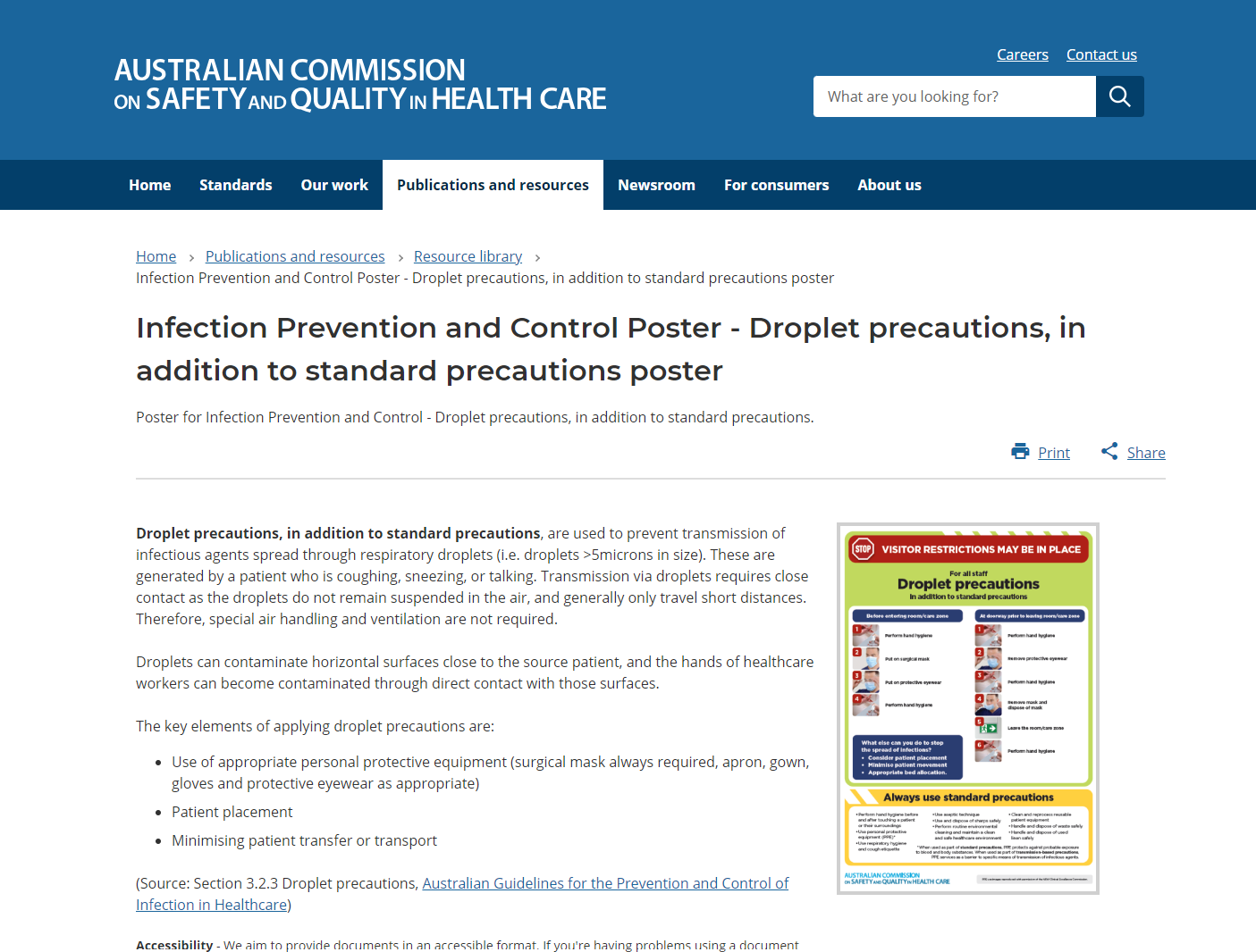 This resource is a poster on droplet precautions, in addition to standard precautions, for infection prevention. It outlines measures to prevent the transmission of infectious agents spread through respiratory droplets, such as using appropriate personal protective equipment (PPE), patient placement, and minimising patient transport. This resource may apply to healthcare contexts outside of aged care. Please consider the applicability of this resource to your care setting.