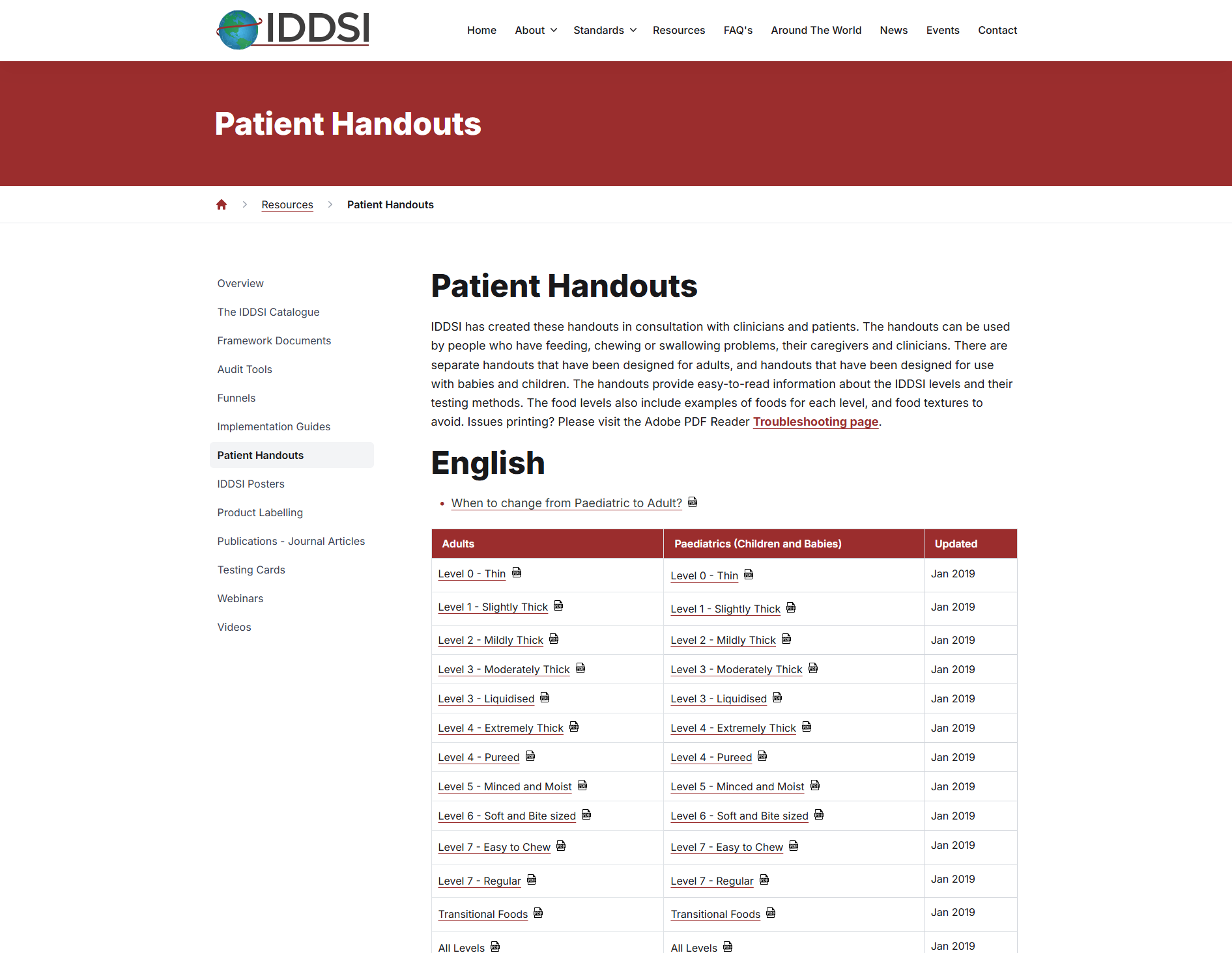 This resource provides handouts tailored for people with feeding, chewing, or swallowing difficulties and their carers. It explains the IDDSI framework, describing food texture levels and appropriate testing methods. Separate versions are available for adults and children, each detailing recommended food textures to support safe swallowing practices.