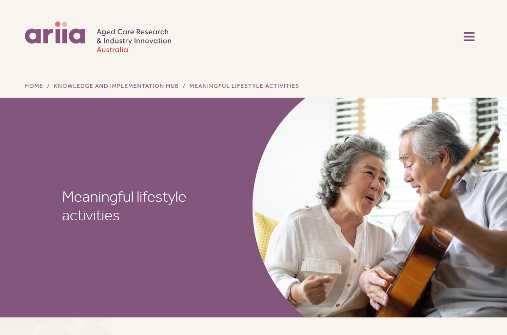 This resource discusses the importance of engagement in meaningful lifestyle activities for people living in aged care. It includes information about understanding meaningful lifestyle activities and links to a collection of resources collated by ARIIA that are relevant to this theme.