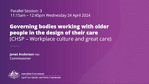 National Aged Care Provider Conference 2024. Parallel session 3: Governing bodies working with older people in the design of their care (CHSP). Presentation by Janet Anderson, PSM Commissioner.