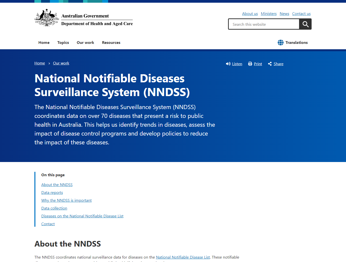 This resource provides an overview of the National Notifiable Diseases Surveillance System (NNDSS), which tracks over 70 diseases that pose a risk to public health in Australia. It helps identify disease trends, supports outbreak responses, and informs public health policies. The system collects de-identified data from states and territories to ensure coordinated disease management.