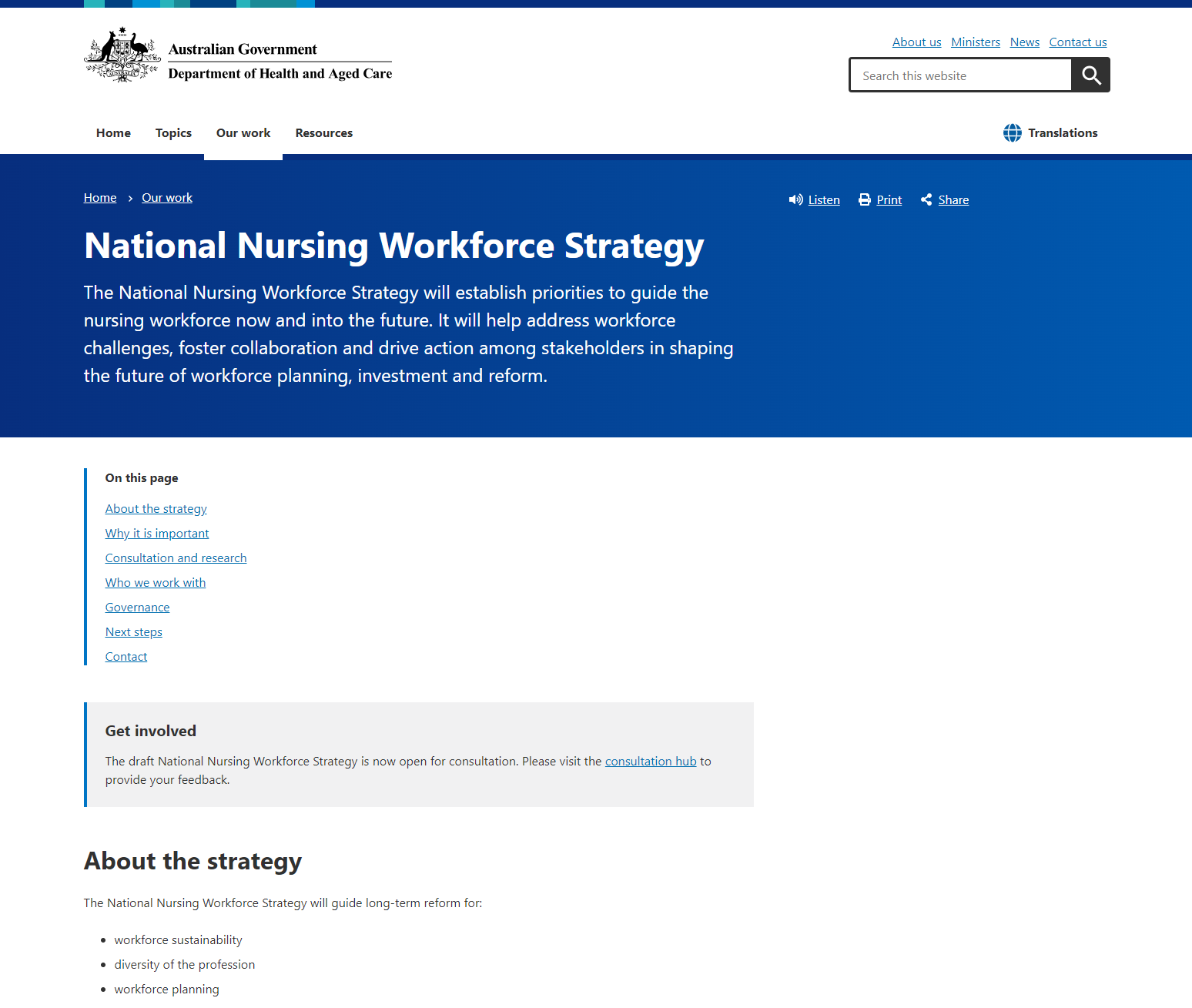 The resource provides information on the National Nursing Workforce Strategy, which outlines long-term plans for workforce sustainability, diversity, and development. It supports collaboration among stakeholders, promotes evidence-based care, and addresses challenges in regional and remote areas to ensure quality nursing care across the healthcare system.