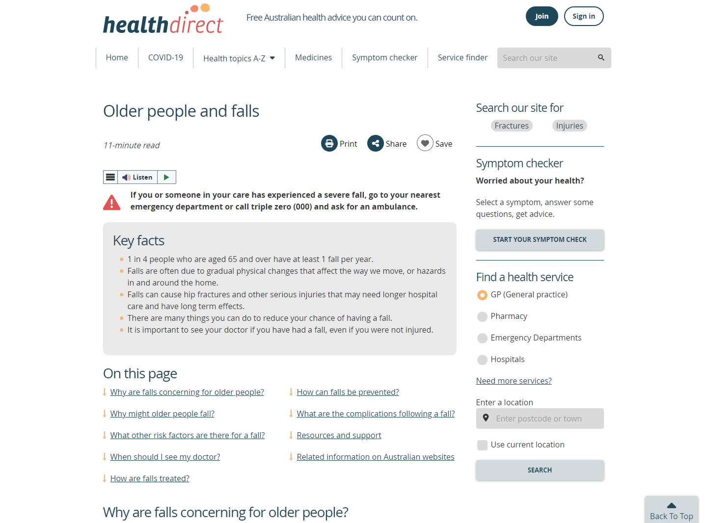 This resource provides information on the causes, treatments, and prevention of falls in older people. It outlines risk factors, such as home hazards and health conditions, and offers practical tips for reducing falls, including lifestyle changes, home modifications, and medical assessments. The document emphasises the importance of fall prevention in aged care settings.