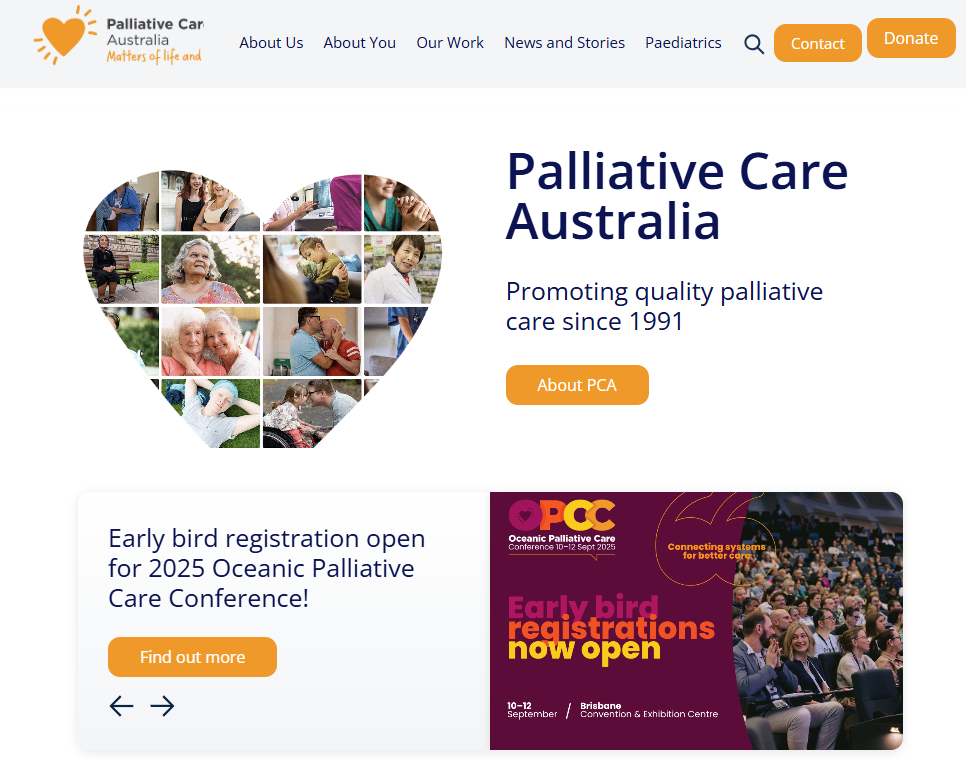 This resource is the Palliative Care Australia website. The website contains targeted guidance and resources for service providers and health care professionals. The resource also includes information about the National Palliative Care Standards, which provide guidance on best practice palliative care in different settings.