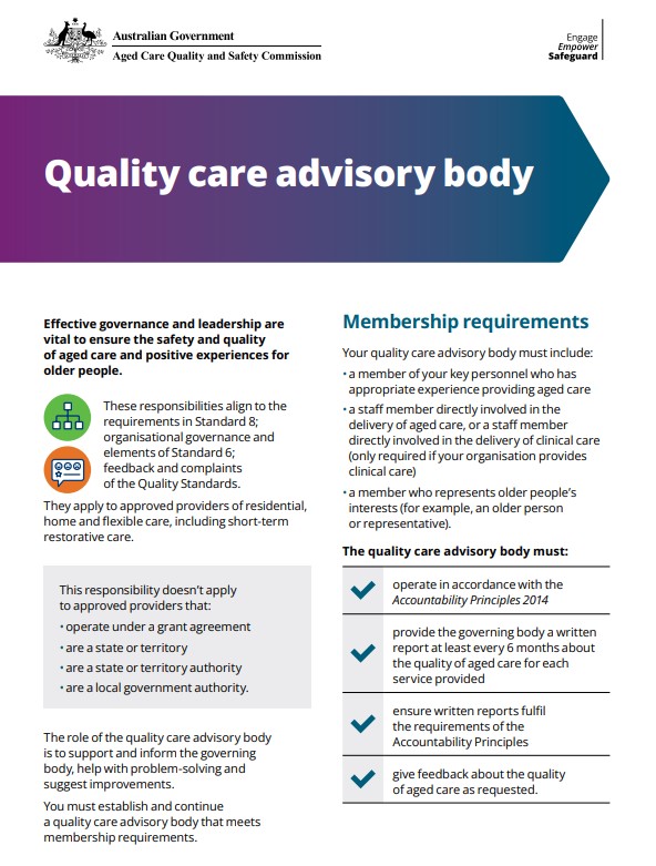 A fact sheet that introduces the responsibility for providers to establish and continue a quality care advisory body.