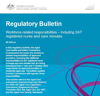 In this regulatory bulletin, the Aged Care Quality and Safety Commission (Commission) discusses the workforce-related responsibilities of approved providers, including the additional responsibilities for 24/7 registered nurse coverage and care minutes that are being introduced from 1 July and 1 October 2023 respectively for approved providers of residential aged care. The bulletin explains how the Commission will regulate these responsibilities.
